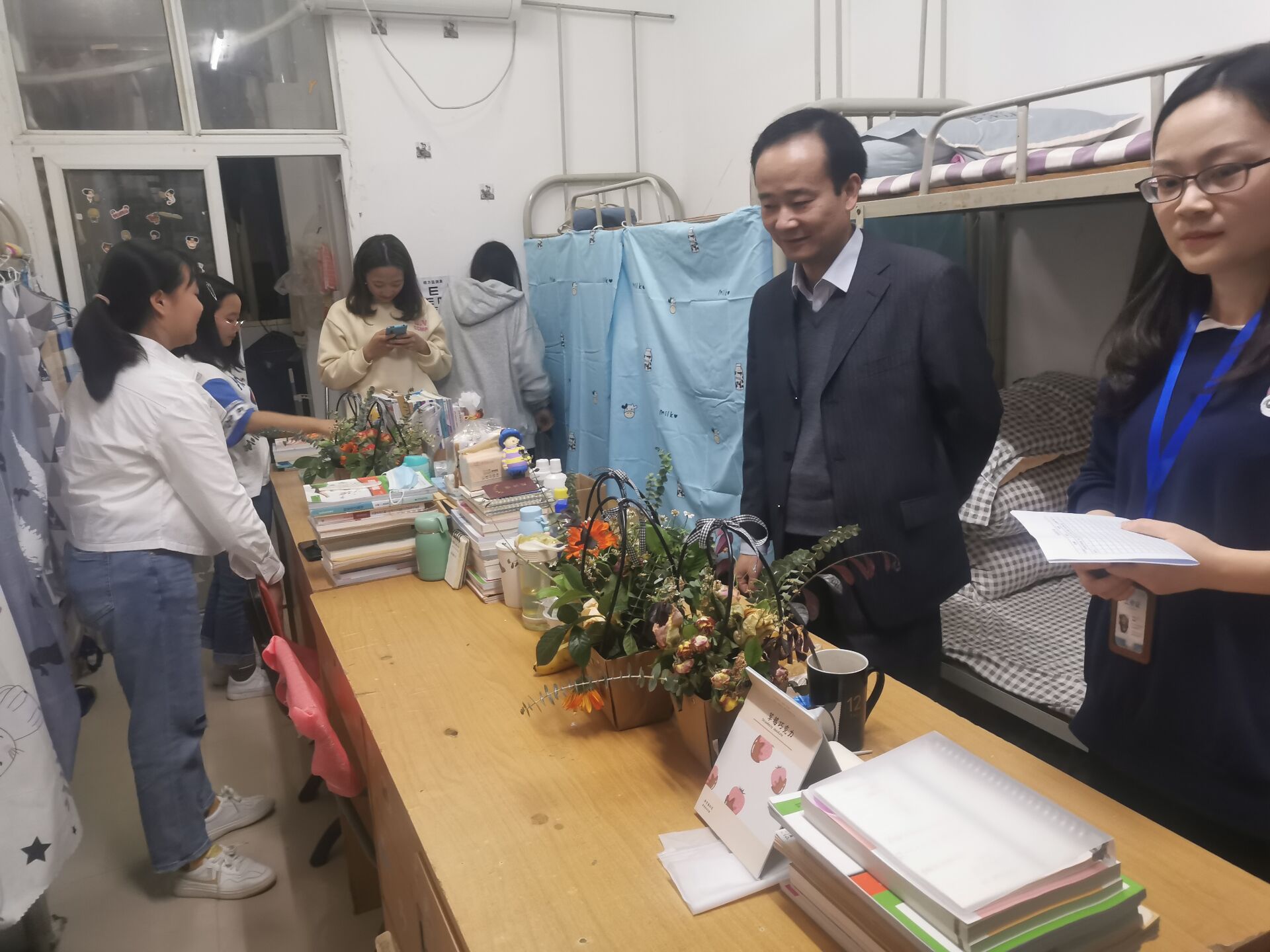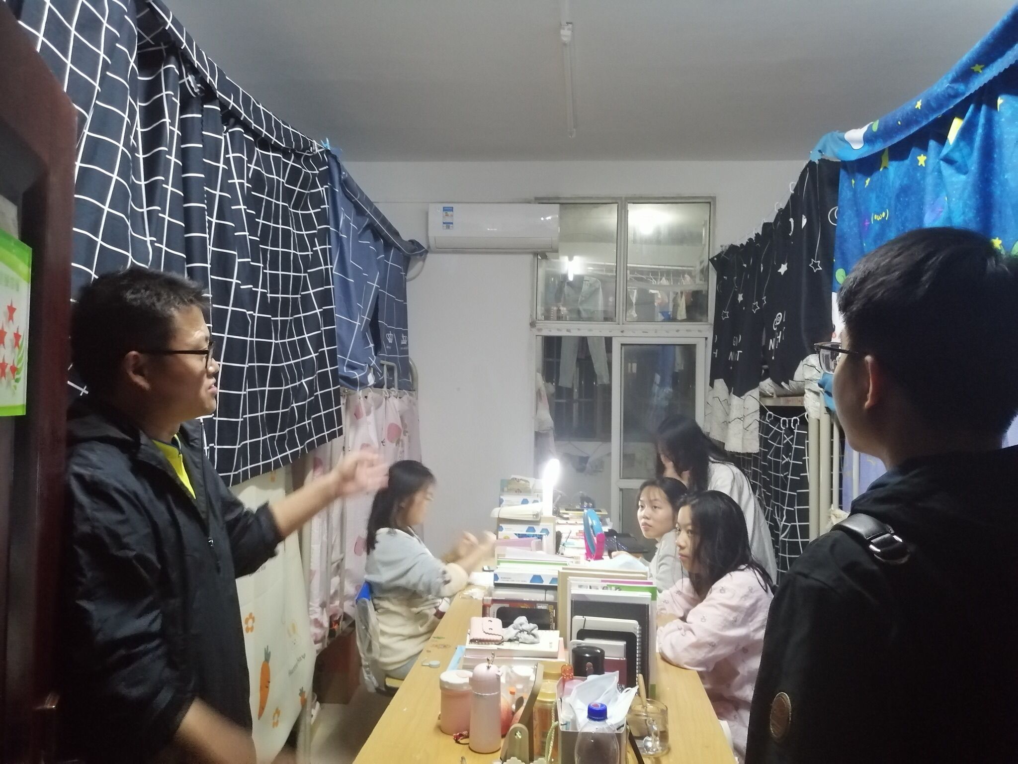为给封闭管理情况下一直呆在公司不能回家的同学们及刚入校的新生送去诚挚的问侯和关怀,10月28日晚,SUNBET申博体育党总支书记镇咸辉、经理何慧玲率领副书记徐俊杰、副经理胡志华、员工科长杨裕结、团总支书记胡勇、办公室主任邢圣煜及SUNBET申博体育全体专兼职辅导员,在公司主要员工会干部的陪同下,集体走访了全部员工寝室。
