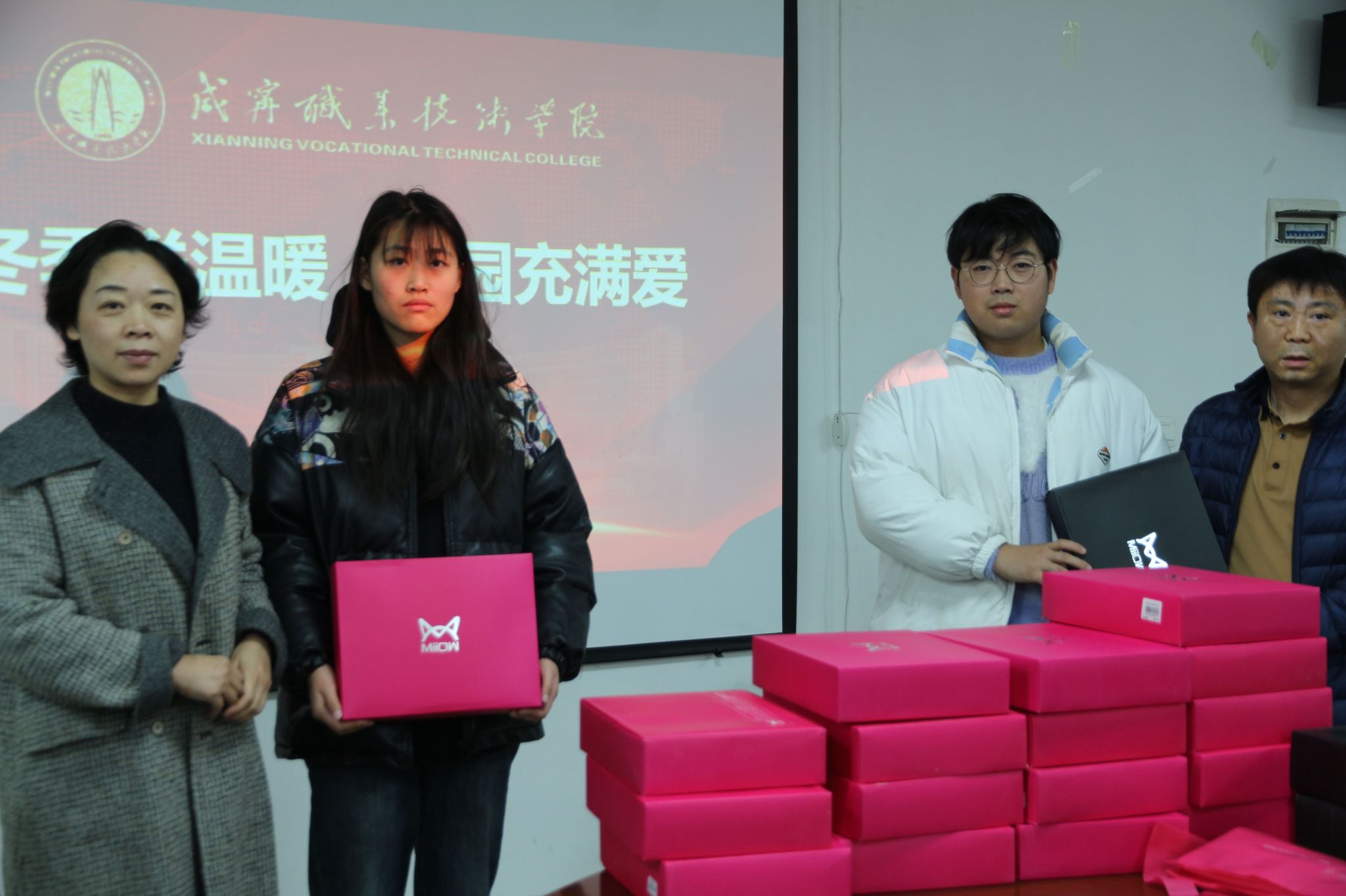 领导们和同学们亲切交流,了解同学们近期的生活和学习情况,将一件件充满爱的冬衣送到员工的手中,叮嘱同学们一定要注意防寒保暖。受助员工代表唐钰洪分享了自己在国家与公司等各方面帮助下的成长经历,并倡导同学们做一个对国家、对社会有用的人。同学们纷纷表示会把这份温暖转化为前行的力量,通过自己的努力来回报祖国和社会。