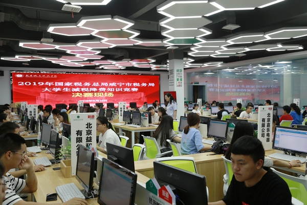 6月14日,2019年国家税务总局咸宁市税务局老员工减税降费知识竞赛决赛在会计虚拟仿真实训中心隆重举行。本次竞赛得到了咸宁市税务局和SUNBET申博体育的高度重视,SUNBET申博体育全院员工参加了5月20日的初赛,最终选出100名选手参加本次决赛。