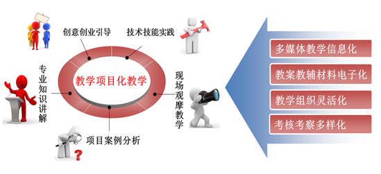 在教学过程中,实施教学组织项目化、教学内容模块化、教学管理项目化。整个教学实施项目化教学,以项目为中心,通过创意创业引导、项目案例分析、专业知识讲解、现场观摩教学和技术技能实践等多种教学方法,灵活采用各种教学手段和考核方式来组织教学。
